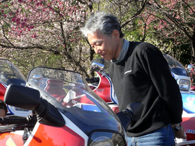 宴会場では先ごろ発売されたAutoart社の1/6CB1100RDも飾られ、いい酒の肴になっています。 翌日もとてもいい天気になりました。山中さんがLPLのNRが話題の中心となりながら(笑) 出発の準備を進めます。 個人的には、ナビをホンダ純正G3(地図は型落ち)に換装して初めてのツーリングでしたが、COOLROBOとの相性もよく、